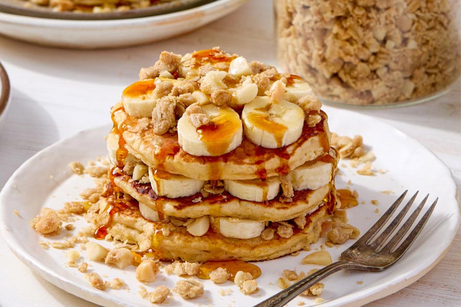 - اضافه کردن مغزهای خردشده مانند بادام، گردو یا فندق میتواند طعمی ترد و خوشمزه به پنکیکها بدهد و ظاهر آنها را جذابتر کند.